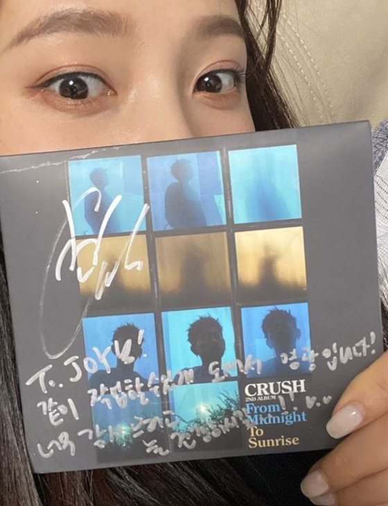 공개된 사진 속 조이는 크러쉬와 얼굴을 맞댄 채 카메라를 응시하고 있다. 다정한 케미를 발산하는 두 사람의 훈훈한 비주얼이 눈길을 사로잡는다. 또 조이는 "나는야 성덕(성공한 덕후)"이라고 덧붙이며 크러쉬에게 미리 받은 사인 CD를 인증하기도 했다.