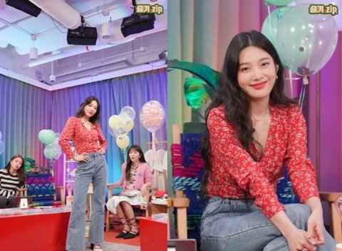 조이는 "(상의는) 레드에 포인트를 줬다. 패턴이 많은 레드 블라우스를 포인트로 입었다. 하의는 캐주얼하게 진(청바지)"라고 설명했다. 이에 슬기는 "하이웨스트가 다리를 길어 보이게 한다. 안 그래도 긴데"라고 말했다.