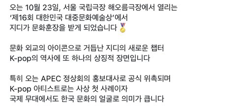 지디 2016년 국무총리상에 받고 2025 APEC 정상회의 홍보대사 선정에 이어서 올해 2025 문화훈장도 받는대..ㅈㄴ대단