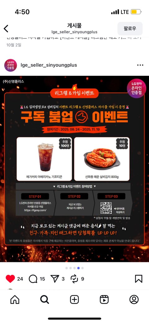 김치냉장고 렌탈하면 김치를 보내줘요 ㅋㅋㅋ근데 맵다고 소문난 실비김치에요 ㅎㄷㄷ...후기이벤트도 하고 리그램?이벤트도 하네요