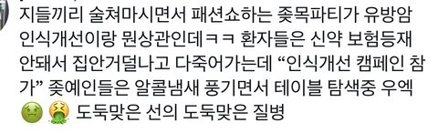 심지어 유방암환자들은 신약보험도 안되고 술도 못마시는데 연예인들 각종 자기들이 하는 명품 두르고 술마시는 사진만 주구장창 올라옴 ㅋㅋ