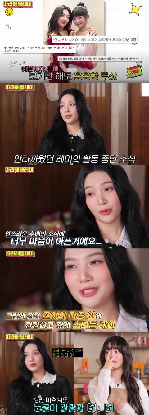 이어 조이는 "그때까지만 해도 그냥 예쁜 후배. 나를 진심으로 좋아해 주던 고마운 후배였는데, 레이가 그때 잠깐 쉬었을 때 너무 마음이 아프고 공감되더라"라며 작년 컨디션 난조로 활동을 중단했던 때를 언급했다.