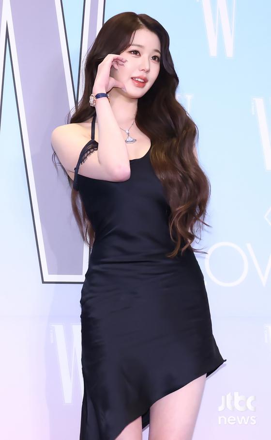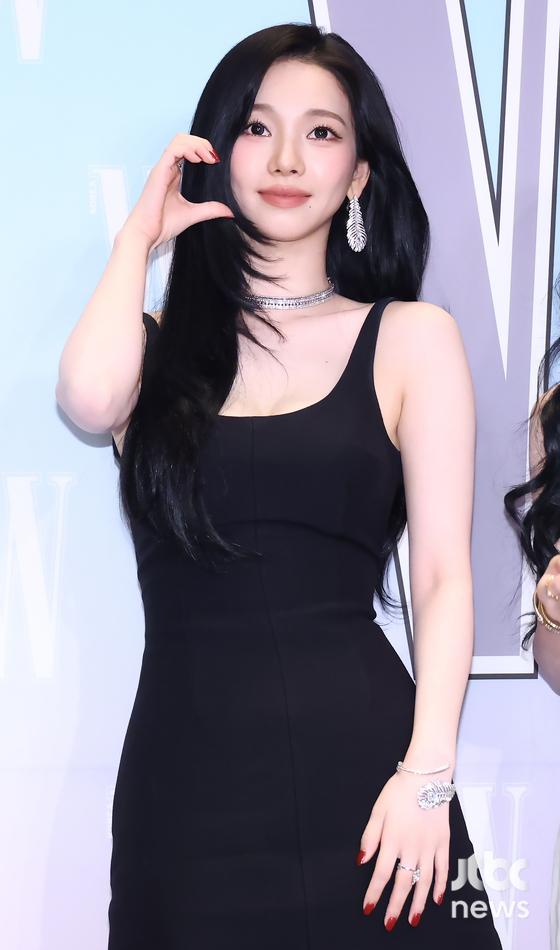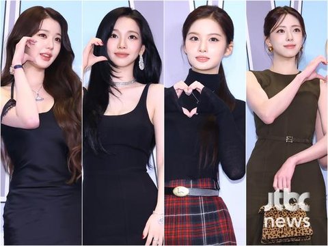 이날 장원영은 비대칭 라인의 블랙 드레스에 웨이브 헤어를 더해 고혹적인 분위기를 자아냈고, 하트를 그리며 사랑스러운 미소로 시선을 사로잡았다. 카리나는 슬림한 블랙 원피스로 시크한 매력을, 여기에 은은한 미소와 하트 포즈로 부드러운 매력을 더했다.