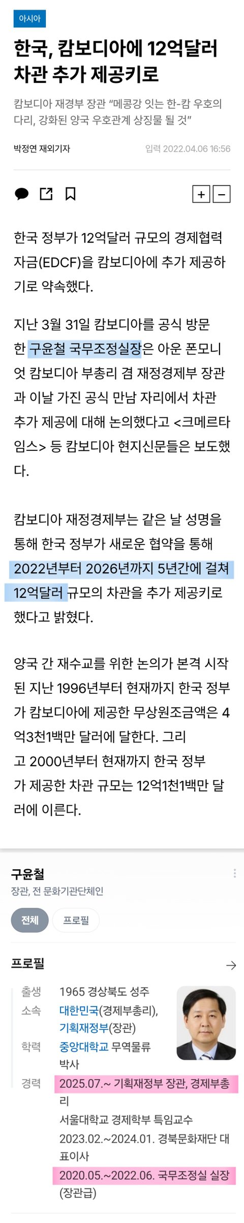 ▶️ 문재인 정권 때 당시 국무조정실장 [구윤철 (현 정부 부총리)]이 캄보디아에 12억 달러 (1조 8천억) 추가 제공 약속함 ▶️ 캄보디아 추가 원조 계획은 애초에 문재인 정권 때 시작한 것이고 윤대통령은 그 약속을 이어받았던거. ▶️ 근데 좌파들은 윤대통령 부부가 캄보디아에 수조원 빼돌렸다고 거짓선동 중