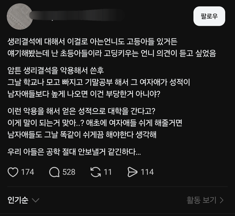 쓰레드 인스타에 가끔 떠서 궁금해가지고 깔았거든 근데 ㅈㄴ 키즈모델 아들맘 여미새 남미새글들 개많아서 내가 다 수치스러움 진짜 공수치글들 ㅈ~~ㄴ많음