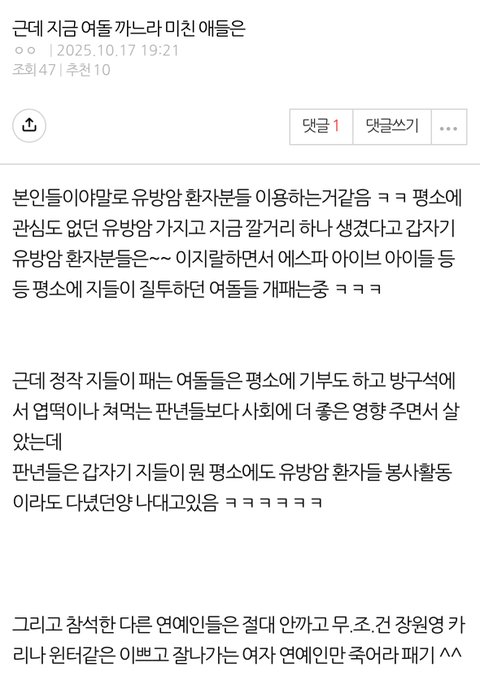 윈터팬 아닌데도 베댓보니까 정국혐 ㅆㅅㅌㅊ되네 아줌마들 시애미짓 표독하게도 한다... 즈그아들이 좋다는데도 여자만 패는 ㄹㅈㄷ