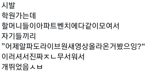 트위터에서 어떤분이 할머니들이 알디원 얘기했대;; 엥? 뭐야?ㅋㅋㅋㅋㅋㅋ 구라같긴한데 저 쓰니가 댓글들 답글에 자꾸 진짜라고함 할머니들이 아는건 옛날 슈주 빅뱅이나 방탄급은 돼야지 알지않음?