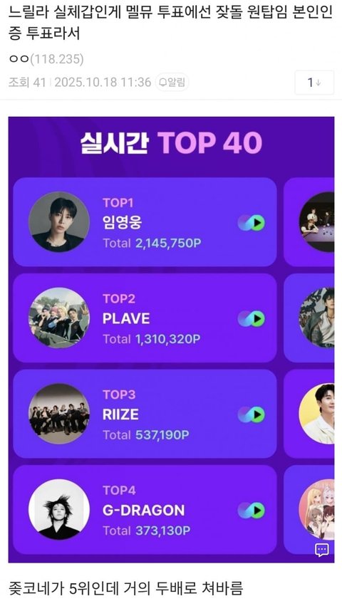 판에 허구한날 라이즈만 탈주한 거처럼 올려대는데 5세대 중에 멜론투표는 제일 높음