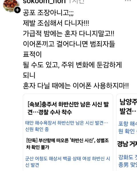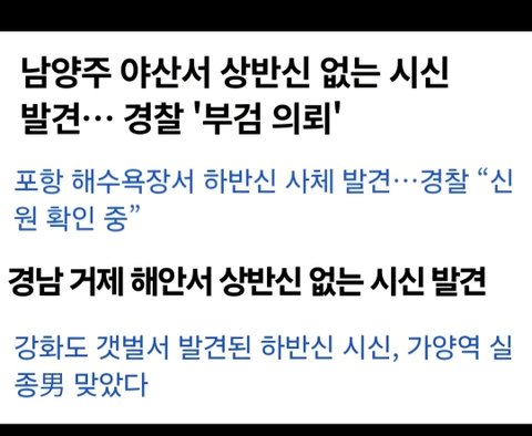 네이버에 하반신 발견 이라고 쳐봐라 제주도 강화도 태안 단양 기사 어마어마하게 나온다. 상체없는 시체 발견 하반신만 발견.