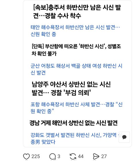 무안공항참사는 이제 그만하자고 짜증내던데 ㅋㅋ 얼마전에도 뼈가 계속 나오고 있던데 처음 수색도 대충뭉겐거지 유가족들이 리죄명 죽이..