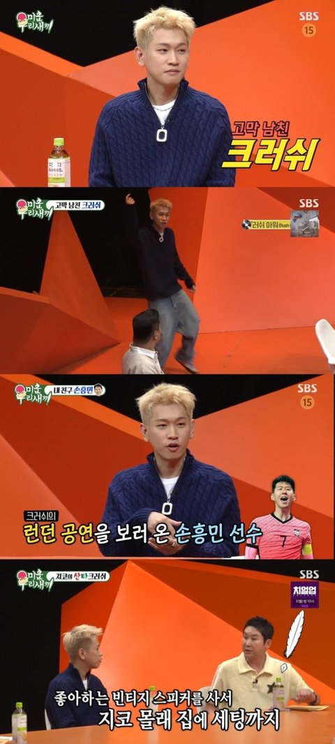 이어 크러쉬는 동갑내기 축구 선수 손흥민과 친분을 과시하기도 했다. 그는 “6년 전 유럽 투어를 했었는데 손흥민 선수가 런던 공연을 보러 왔다. 같이 축구도 하는 사이다. 축구 게임도 잘하더라”라고 밝혀 흥미를 유발했다.