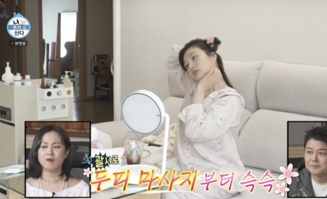 이어 셀프 메이크업까지 마친 조이. 고주파와 부항원리의 다리 마사지까지 했다. 혈액순환을 해주기 위한 것이었다.그러면서조이는 “화병 쌓였나보다”며 “토양체질, 상체가 부었기 때문”이라며 몸 풀기에 집중했다