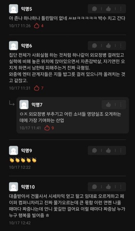 과분하게 번 돈으로 투기 탈세는 ㅈㄴ하고 지식도 짧아서 선동도 잘당하는 주제에 정치얘기 같잖게 하면 모지리 팬들이 깨어있다고 박수쳐주는게ㅈㄴ웃김ㅋㅋㅋㅋㅋ