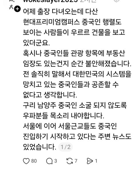 우리 옆 동은 시에서 중국인 제일 많은 동인데 중국 애들 자리잡기 시작하니까 진짜 못 사는 동네로 전락해버리더군 그 여파가 우리 동까지 미치겠지