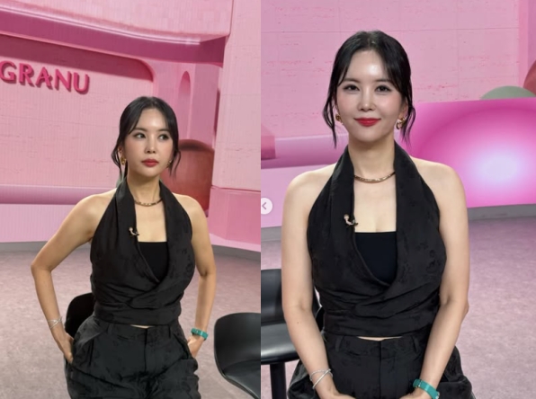 장영란은 어깨와 팔 라인이 고스란히 드러나는 올 블랙 의상을 입고 있으며, 군살 없는 직각 어깨와 매끈한 팔뚝이 눈길을 끈다.