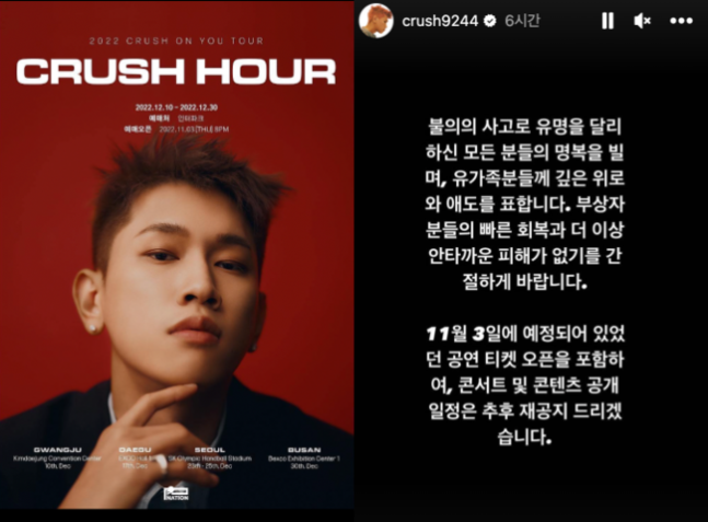 그러면서 크러쉬는 “불의의 사고로 유명을 달리 하신 모든 분들의 명복을 빌며, 유가족분들께 깊은 위로와 애도를 표합니다"라며 "부상자분들의 빠른 회복과 더 이상 안타까운 피해가 없기를 간절하게 바랍니다"라고 애도했다.