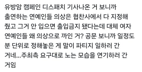 유방암 행사 공문봐라 파티장이래ㅋㅋㅋㅋ초대받은 애들은 지시사항대로 차려입고 컨셉대로 일하고 온거임 심지어 박보영은 작년에 브랜드 스타킹 착용 안해서 출입 거부당했다며ㅋㅋㅋㅋ초대한 연예인까지 지들 지시사항 안 따랐다고 안 들여보내는데 올해라고 별 수 있었겠음?