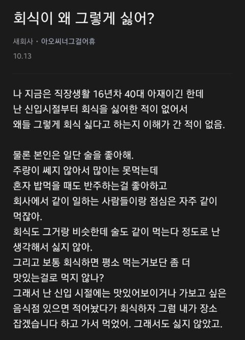 40대 아짐인데 회식 싫어.. 일부 남정네들 술의 힘을 빌어 입이 자유를 찾으면 어린 여직원 앞에서 은근히 자기 아직 쓸만하다고 강조하는 거.. 그거 되게 꼴불견이야.. 어린 애들 보기에도 창피하고... 그리고 먹고 싶은 거 내돈내산할 정도는 버니 그냥 사먹으면 돼. 또 휴식을 해도 모자랄 평일(혹은 금요일) 저녁시간을 왜 직장동료들과 공유해야 하는지도 모르겠어. 특히 쓴이 같은 이들이 2차를 외치면 스템플러로 콕콕 찝어주고 싶더라... 쓴이야... 나도 나이가 40대이고 끊임없이 회사생활했지만 술자리에서 뭘 배운 적은 없어... 술자리에서 배우긴 뭘 배워... 진짜 병신 같은 상관에게도 배울 점이 있다는 말에는 동의하지만 그게 술자리에서 나오지는 않을거야... 배우는 건 사무실, 내가 속한 팀 안에서 배우는 것만으로도 충분해... 술자리에서 뭘 전수할 생각을 하지말고 우리 사무실 안에서 잘 하자...