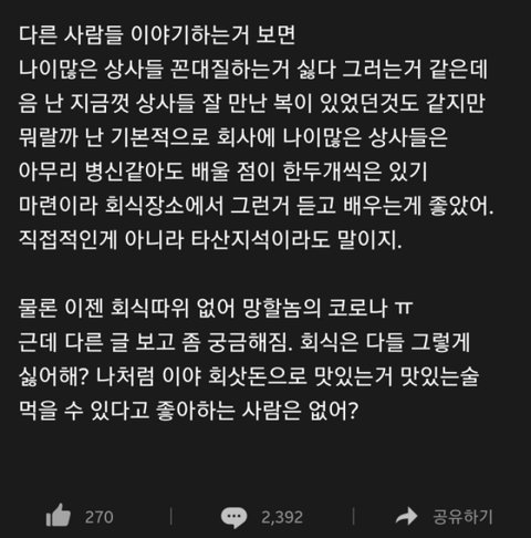 그지새ㄲ도 아니고 회식으로 뭐 몇십짜리 오마카세 가는것도 아니고 돈없어서 못 먹을 형편도 아니고. 맛있는것도 내가 좋아하는 사람들이랑 같이 먹고 즐겨야 좋은거지 다들 지처럼 공짜라고 눈 뒤집혀서 먹으러 다니질 않는다는걸 모르는거보니 쟤도 이미 꼰대임