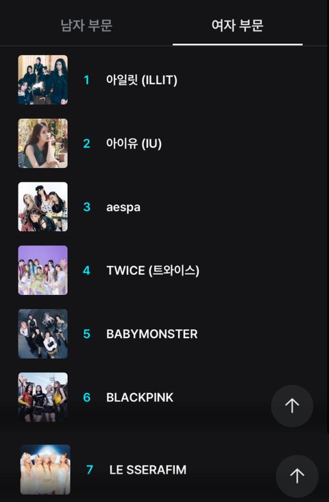 방탄, 세븐틴, 투바투, 엔하이픈, 보넥도, 엑소, 엔씨티, 라이즈, 스키즈, 킥플립, 트레저, 제베원, 아일릿, 뉴진스, 아이브, 에스파, 하투하, 트와이스, 엔믹스, 르세라핌, 미야오, 베몬, 이즈나, 장원영, 카리나, 윈터, 안유진, 제니, 로제, 지수