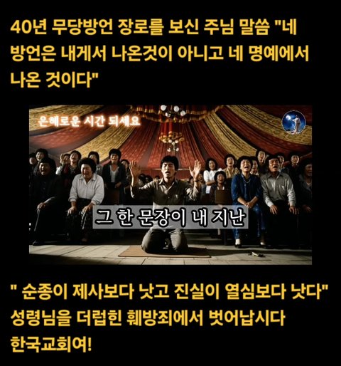 40년 무당방언 장로를 보신 주님 말씀 "네 방언은 내게서 나온것이 아니고 네 명예에서 나온 것이다" " 순종이 제사보다 낫고 진실이 열심보다 낫다" 성령님을 더럽힌 훼방죄에서 벗어납시다 한국교회여!