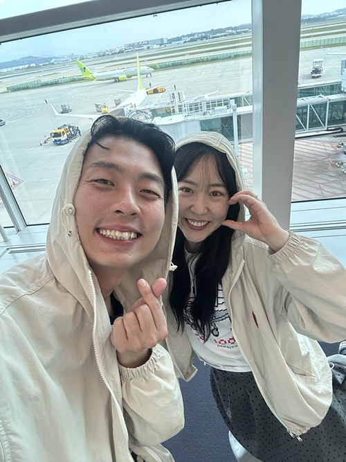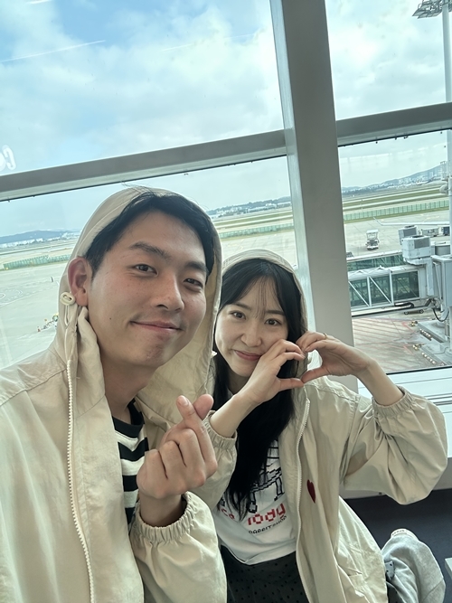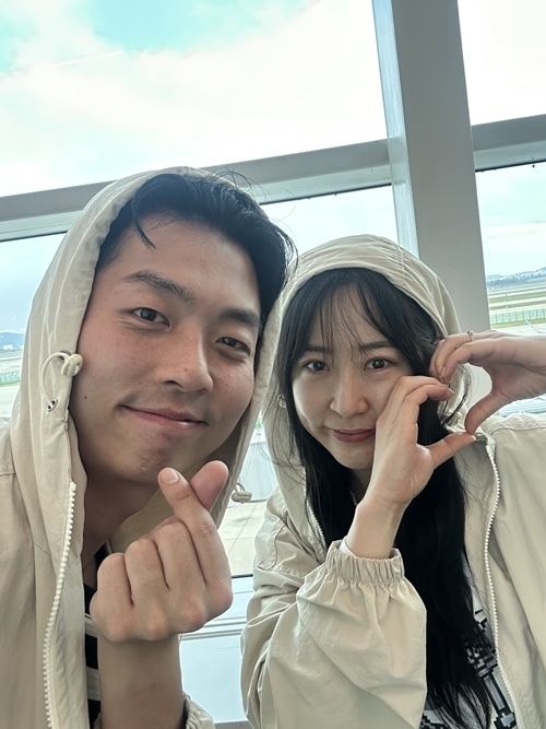 19일 오전 인천국제공항 출국장. 전날(18일) 서울 여의도 웨딩컨벤션에서 결혼식을 올린 두 사람은 나란히 베이지빛 커플 점퍼를 입고 등장했다. 비행기 탑승을 앞두고 손하트와 하트 포즈로 인사를 건네며, 신혼의 설렘이 가득 담긴 미소를 지었다.