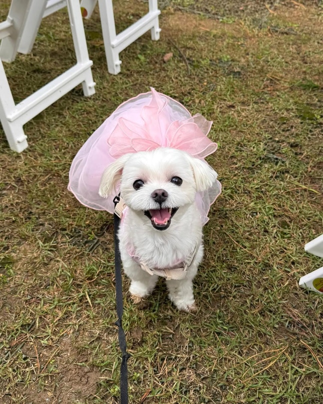 공개된 사진 속 조이는 똑 닮은 두 여동생과 함께 사진을 남기고 있으며, 특히 가운데에 앉은 첫째 동생이 웨딩드레스를 입고 있어 시선을 집중시킨다.