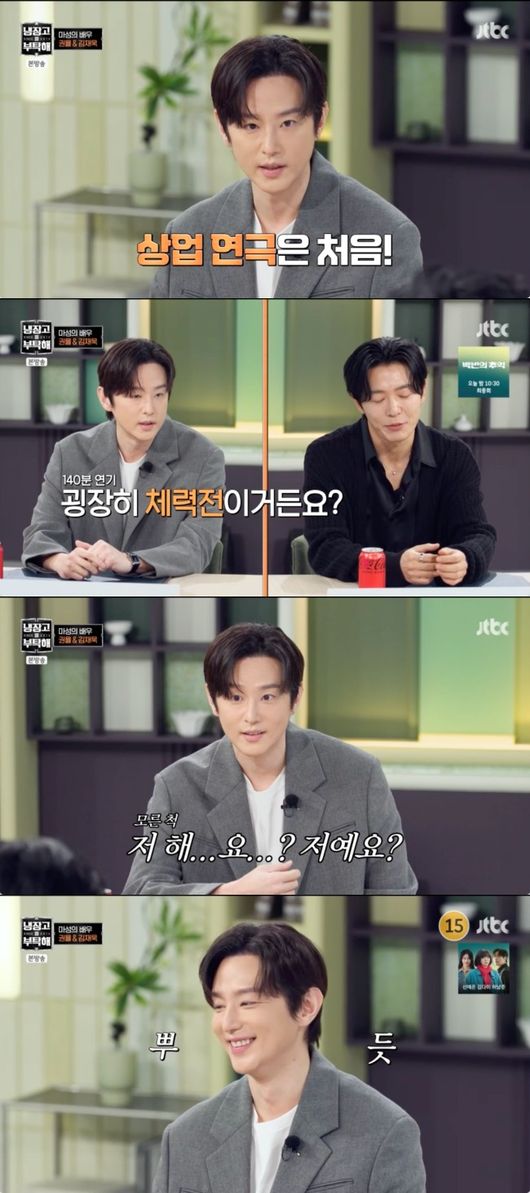 이날 권율은 연극 공연에 대해서 “전공을 연극 전공을 하긴 했는데 상업 연극은 처음이다. 고생을 많이 하고 있다”라고 말문을 열었다. 김재욱은 “베테랑도 힘들어 하는 역할인데 용감하게 선택하시고 바로 후회하시더라”라고 폭로했다.