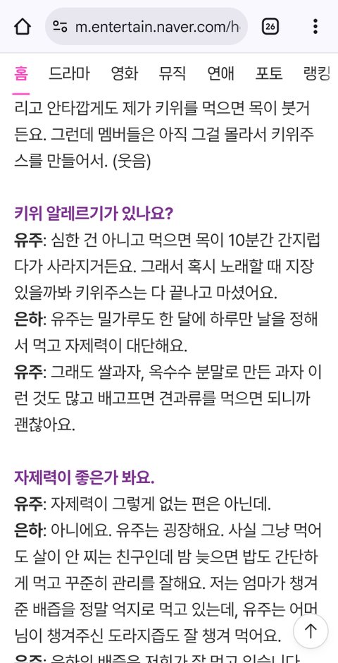 유주가 복명가왕 나갈때 멤버들이 도시락으로 키위 주스 만들어서 준적 있음 근대 유주는 키위 알레르기 가 있단말이지. 알레르기 있으면 안먹어야하는데 유주는 촬영끝나고 키위주스를 마셨음..진짜 상냥하지 않아?