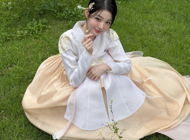 사진 속 장원영은 전통과 현대가 조화된 개량 한복을 완벽하게 소화했다. 하얀 저고리와 은은한 살구색 치마의 조합은 그의 깨끗하고 화사한 미모를 더욱 돋보이게 한다. 특히 어깨와 허리 부분에 들어간 섬세한 자수 장식은 고급스러운 ‘왕실 공주’ 분위기를 물씬 풍긴다.