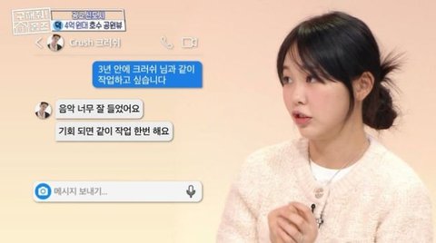 이에 미노이는 “저는 크러쉬 오빠를 너무 좋아해 공연 관람도 했다”며 “실제로 아직 못 만났다”고 했다.심지어 20세 때 DM 보냈다는 미노이는 “목표는 3년 안에 오빠랑작업하고 싶다고 해, 그때 같이 작업 한번 하자고 답장 왔다”면서“’답장을 하다니’ 이러면서 설렜다”며 팬심을 보였다.