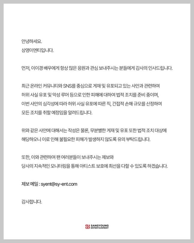 소속사 상영이엔티는 10월 20일 공식 계정을 통해 "최근 온라인 커뮤니티와 SNS를 중심으로 게재 및 유포되고 있는 사안과 관련, 허위 사실 유포 및 악성 루머 등으로 인한 피해에 대해 법적 조치를 준비 중이며, 이번 사안의 심각성에 따라 허위 사실 유포에 따른 직, 간접적 손해 규모를 산정해 모든 조치를 취할 예정임을 알려드린다"고 밝혔다.