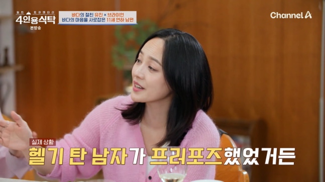 사진=채널A '4인용식탁'완고한 거절에도 남편이 포기하지 않자 바다는 "'건태 씨 헬기 있어요?'라고 물었다"고 밝혔다. 유진은 "실제로 헬기 탄 남자가 프러포즈하러 왔었다"고 설명했다.