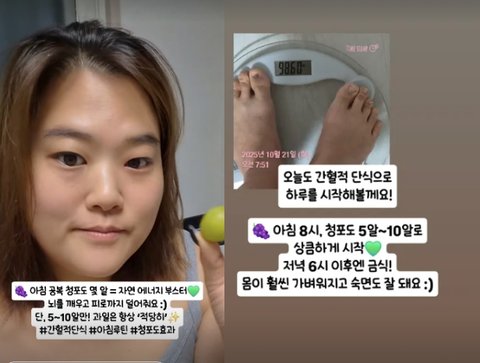 박수지는 21일 개인 채널에 “오늘도 간헐적 단식으로 하루를 시작해 볼게요! 아침 8시, 청포도 5알~10알로 상큼하게 시작. 저녁 6시 이후엔 금식! 몸이 훨씬 가벼워지고 숙면도 잘 돼요”라는 글을 게재하며 간헐적 단식으로 하루를 시작한다고 밝혔다.