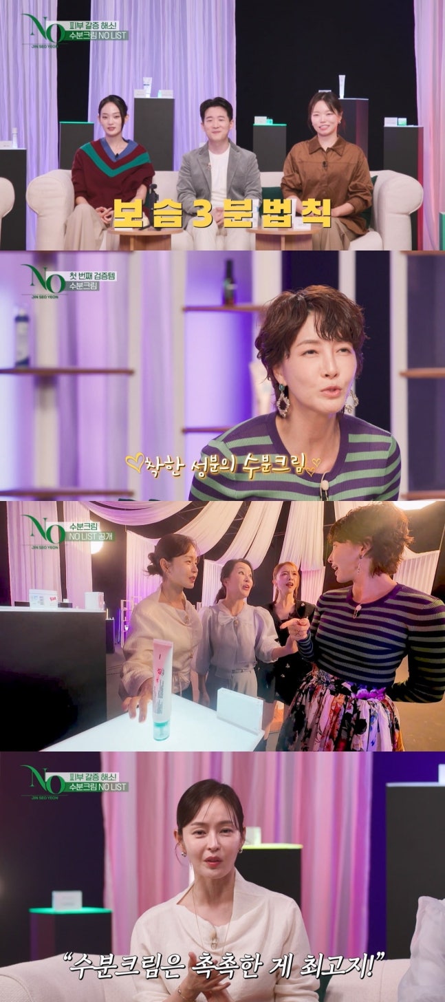 사진='진서연의 NO'첫 번째 검증템, 수분크림은 유해 논란 성분이 없는 제품 총 30개가 선정됐다. '팀 진서연'은 각자 둘러보며 'NO.1 PICK'으로 예상되는 제품을 골랐다. 그런 가운데 '뷰린이' 방민아는 "수분크림을 바르고 많이 두드리면 흡수가 더 잘되냐"라며 소문의 진위여부 검증에 나섰다. 한국피부과학연구원 원장 안인숙은 "보습 3분 법칙을 기억해라. 세안 후 3분이 지나면 피부 수분 손실이 급격히 증가한다. 수건으로 물기를 가볍게 제거하고 3분 안에 수분크림을 바르면 피부 위 수분과 함께 보습 성분을 효과적으로 흡수한다"라며 꿀팁을 전했다. 조광현은 "피부에 손길이 닿지 않는 게 좋다. 중지가 제일 사용을 안 하는 손가락이다. 중지를 이용해 한 겹씩 도포하며 덧바르면 좋다"라고 덧붙였다.