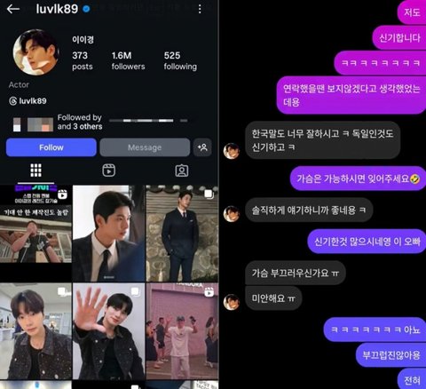 지난해 1월 나눈 대화에서 이이경 추정 인물은 A씨 가슴 크기를 묻는 등 성적인 대화를 이어갔다. 그는 자신을 독일인이라고 밝힌 A씨에게 "솔직하게 다 말하는 게 좋다" "카카오톡 ID 있나"라며 지속적인 호감을 내비쳤다.