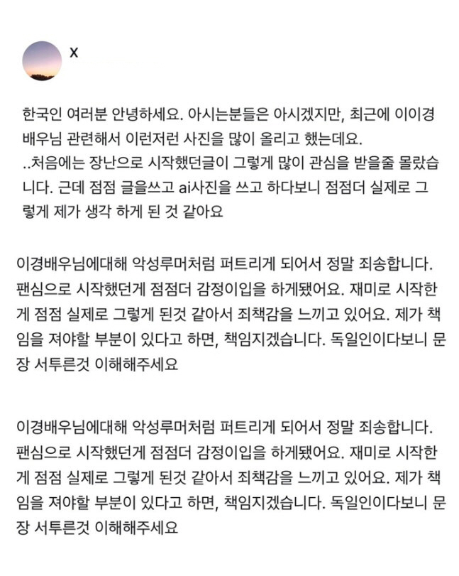 독일인 여성 A씨는 22일 "최근 이이경 관련해서 이런 저런 사진을 많이 올렸다"면서 "처음에는 장난으로 시작했던 글이 그렇게 많이 관심을 받을 줄 몰랐다. 근데 점점 글을 쓰고 AI 사진을 쓰고 하다 보니 점점 더 실제로 그렇게 제가 생각하게 된 것 같다"며 사과 글을 게재했다.