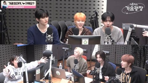 왼쪽 위부터 시계 방향으로 태산, 리우, 명재현, 운학, 이한, 성호, 이은지 (사진=KBS 쿨FM ‘이은지의 가요광장’ 캡처)