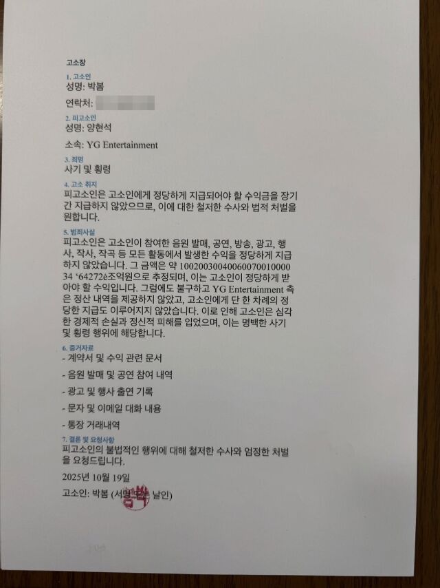 박봄은 22일 자신의 계정에 양현석 프로듀서를 대상으로 한 고소장 내용을 업로드했다. 이 문서에서 박봄은 "피고소인은 고소인에게 정당하게 지급되어야 할 수익금을 장기간 지급하지 않았으므로, 이에 대한 철저한 수사와 법적 처벌을 원한다"고 주장했다.