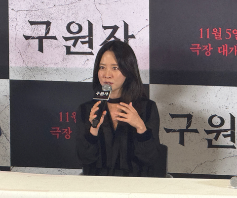 22일 오후 서울 CGV 용산아이파크몰에서 열린 영화 <구원자> 언론배급시사회 및 기자간담회에서 배우 송지효가 말하고 있다. 김민지 기자