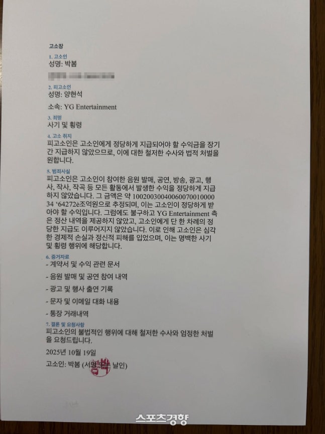 이에 따라 박봄은 심각한 경제적 손실과 정신적 피해를 입었으며 이는 명백한 사기 및 횡령 혐의라고 주장했다. 해당 고소장은 지난 19일 작성된 것으로 적시됐다.