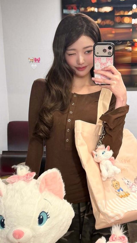 사진 속 장원영은 긴 웨이브 머리카락을 늘어뜨린 채 윙크를 한 모습. 추워진 날씨에 긴 상의를 입고 귀여운 키링이 달린 가방을 멘 모습이다.