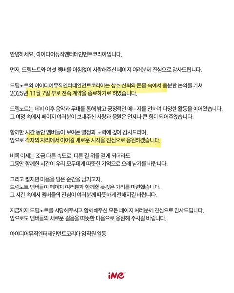 걸그룹 드림노트 11월 7일 계약만료 해체
