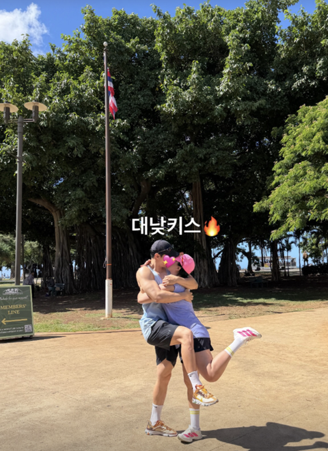 공개된 사진 속에는 랄랄이 11살 연상의 남편과 하와이의 한 거리에서 입을 맞추는 모습이 담겼다. 커플룩을 맞춰 입은 두 사람은 서로를 꼭 끌어안으며 신혼의 설렘을 여과 없이 드러냈다.