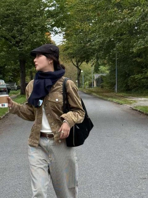 슬기 소셜미디어슬기는 카키색 재킷과 스트라이프 팬츠로 스타일리시한 패션을 선보였다.