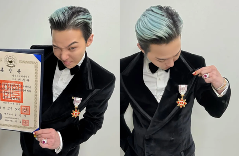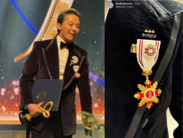 지난 23일 지드래곤의 부계정 SNS에는 별다른 설명 없이 여러 장의 사진이 업로드됐다. 공개된 사진 속 지드래곤은 서울 중구 국립극장 해오름극장에서 열린 '2025 대한민국 대중문화예술상' 시상식에서 훈장을 수여받는 모습이었다. 그는 한류 확산과 K-팝의 세계화에 기여한 공로를 인정받아 대중음악인 중 최연소로 옥관문화훈장을 받았다.