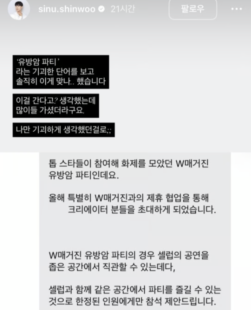 사진= 시누 SNS23일 패션 유튜버 시누(본명 전신우)가 W코리아 초대장에서 ‘유방암 파티’라는 표현이 사용된 사실을 공개하며 또 한 번 논란이 됐다. 시누는 “‘유방암 파티’라는 기괴한 단어를 보고 솔직히 ‘이게 맞나’ 했다. ‘이걸 간다고?’ 생각했는데 많이들 가셨더라. 나만 기괴하게 생각했던 걸로”라며 황당함을 전했다.실제로 W코리아는 공식 홈페이지와 연예인 초대장에도 ‘유방암 파티’라는 문구를 그대로 사용했다. 초대장에는 “본 캠페인은 유방암의 위험성을 널리 알리고 예방과 치료에 큰 힘을 보태고자 하는 데 목적이 있다”면서도 “이를 위해 특별히 마련한 파티”라고 기재돼 있어, 유방암 인식 개선과는 거리가 먼 행사라는 지적이 이어지고 있다.