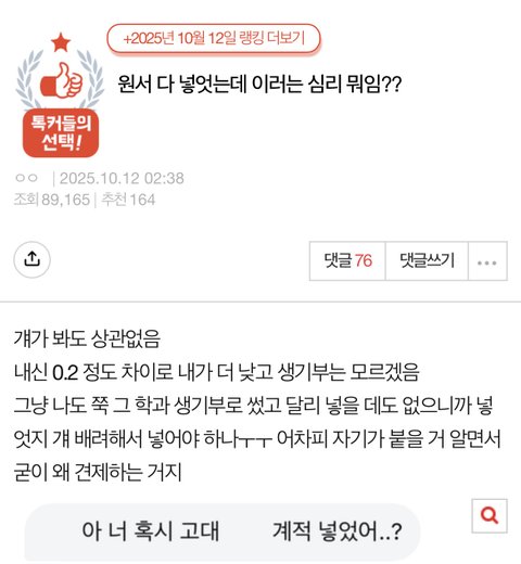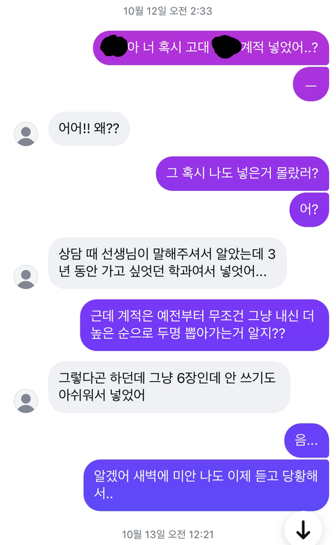 댓글 분들 다 입시 안 해 보신 건지 모르겠지만 보통 고려대 계열적합형은 한 학교에서 한두 명 정도밖에 안 뽑아줍니다... 저는 절대 나쁜 의도로 저런 연락 한 게 아니고 저 친구가 계적을 쓴다면 저는 교과를 써서 양보해 주려 했는데 저 친구가 고려대를 포기한다고 저에게 연락하는 바람에 전 그대로 계적을 썼어요. 근데 또 원서 쓰고 보니 다시 계적을 썼다길래 당황스러워서 저 친구가 떨어질까 봐 연락한 건데ㅋㅋㅋㅋㅋ 뭔 제가 수시원서 가지고 기싸움하는 사람 마냥 취급받고 있네요... 저 글쓴이가 관심받고 싶어서 쓴 글 에서 70명 넘는 사람에게 욕 먹고 있으니 너무 억울하고 분해서 글 씁니다