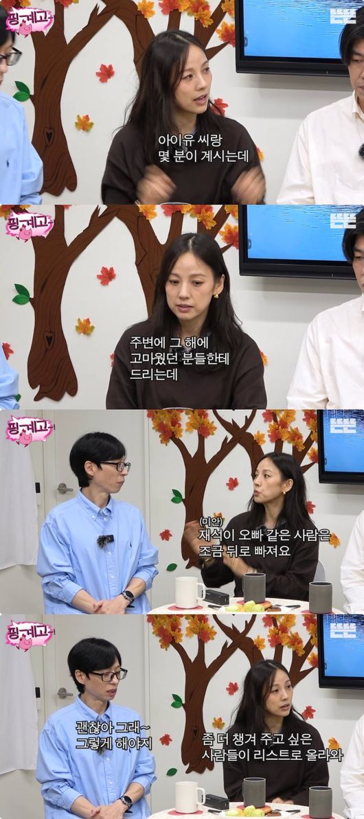 이효리는 “너무 고맙다. 친구가 제주에서 망고밭을 하는데 너무 맛있다. 그 밭을 거의 하나 사다시피 해서 주변에 그 해에 고마웠던 분들에게 드리는데, 재석이 오빠 같은 사람은 조금 뒤로 빠진다. 왜인지 모르는데 좀 더 챙겨 주고 싶은 사람들이 리스트로 올라온다. 만약에 두 분이 더 인기가 많아지면 잘린다”라며, “‘이 분들은 이거 자기가 사먹을 수 있겠지. 충분하겠지’, ‘이 분들은 우리가 안 챙겨줘도 어디서 많이 받겠지’ 하는 마음이 있다”라고 말했다.