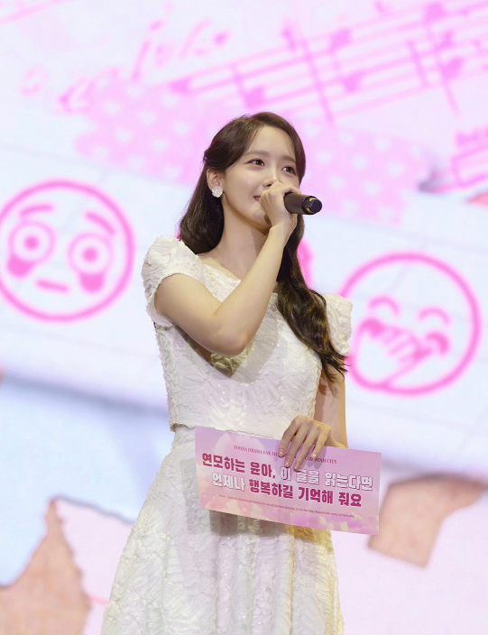 공개된 사진 속 윤아는 순백의 레이스 드레스를 입고 밝은 미소로 코코넛을 들고 포즈를 취하며, 특유의 청순하면서도 세련된 분위기를 자아냈다.무대에서는 “연모하는 윤아, 이 글을 읽는다면 언제나 행복하길 기억해줘요”라는 문구가 담긴 플래카드를 들고 팬들에게 감사를 전하기도 했다.